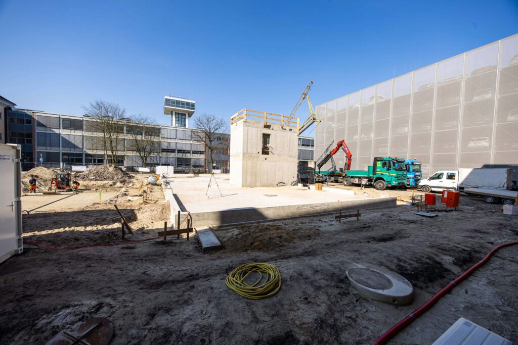 Und es geht weiter: Auf dem Nachbargrundstück entsteht ein neues Gebäude für den Fachbereich Bauwesen – die Arbeiten am Rohbau laufen auf Hochtouren, sodass das Gebäude nach aktueller Planung Anfang nächsten Jahres der Jade Hochschule zur Verfügung stehen wird.